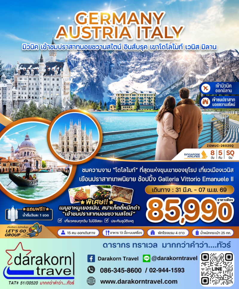 ทัวร์ยุโรป - ปราสาทนอยชวานสไตน์ โดโลไมท์ เวนิส 8วัน5คืน(SQ)เดือนมีนาคม 2569