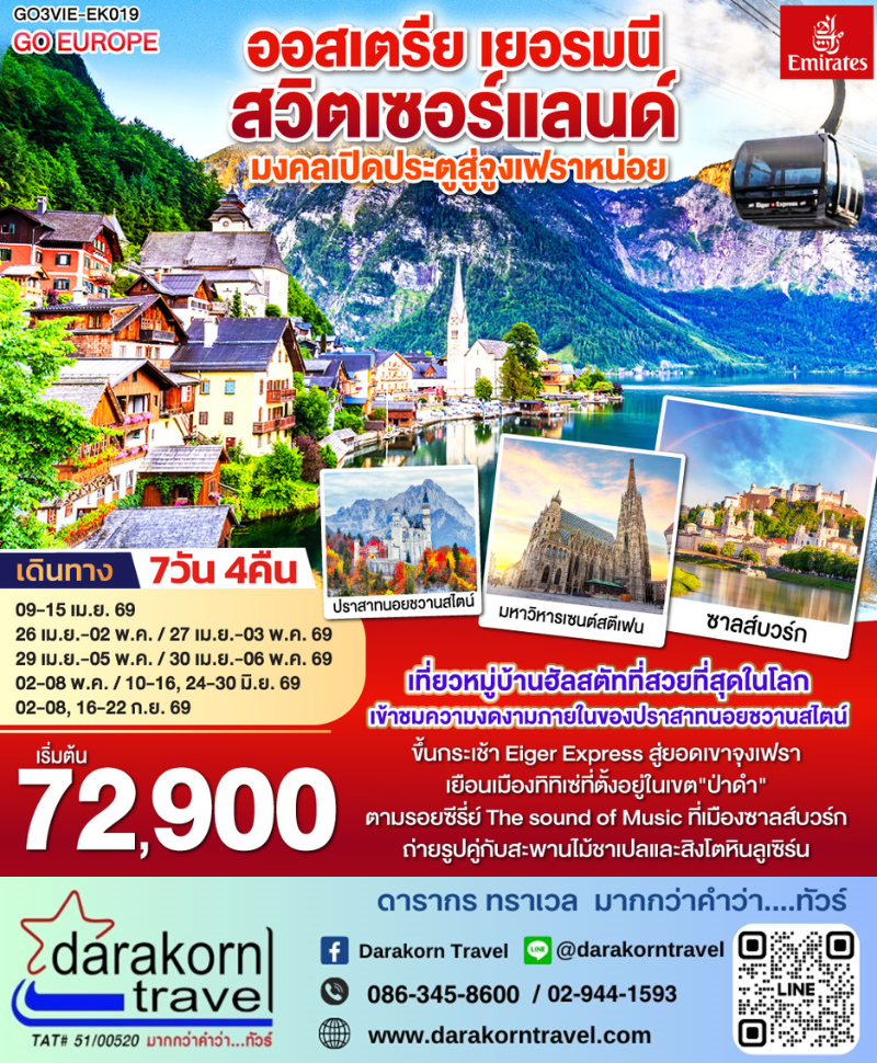 | DAY 3 | เวียนนา – ฮัลสตัท – เดินเล่นหมู่บ้านมรดกโลก– ซาลส์บวร์ก -ชมสวนมิราเบลล์ – ชอปปิงถนนเกไทรย์เดอกาสเซอ – โรเซนไฮม์(ประเทศเยอรมนี ) |