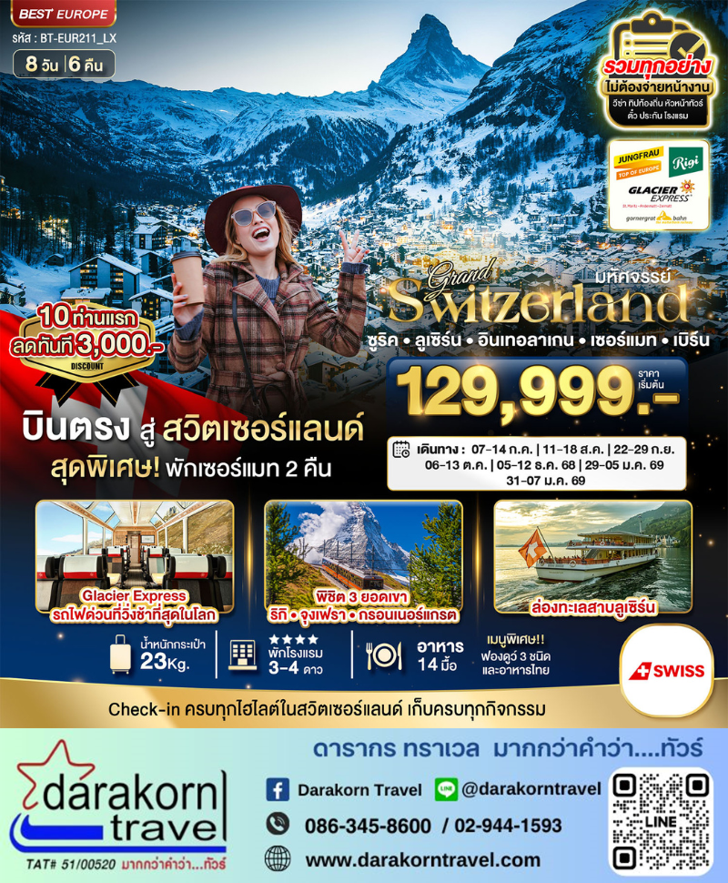 ทัวร์ยุโรป – มหัศจรรย์…แกรนด์สวิตเซอร์แลนด์ (ริกิ-จุงเฟรา-กรอนเนอร์เกรต-กลาเซียร์เอ็กซ์เพรส) 8วัน6คืน(LX)เดือนกันยายน – ธันวาคม 2568 |