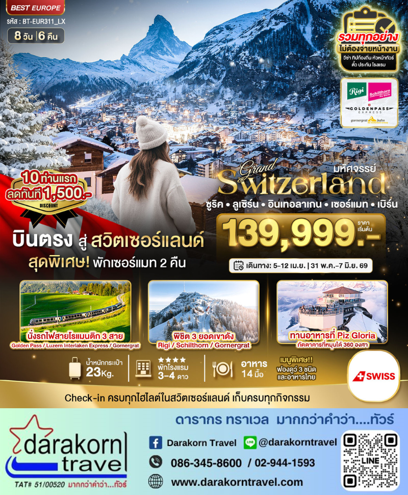 ทัวร์ยุโรป - มหัศจรรย์...แกรนด์สวิตเซอร์แลนด์ 3 รถไฟ 3 ยอดเขา 8วัน6คืน(LX)เดือนเมษายน - พฤษภาคม 2569
