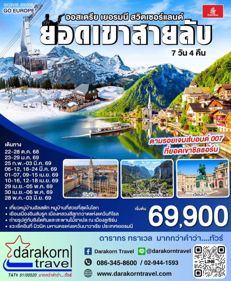ทัวร์ยุโรป - ยอดเขาสายลับ ออสเตรีย เยอรมนี สวิตเซอร์แลนด์ 7วัน4คืน(EK)เดือนตุลาคม 2568 - พฤษภาคม 2569