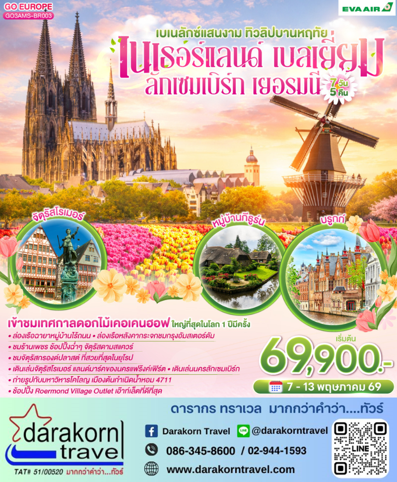 ทัวร์ยุโรป - เบเนลักซ์แสนงาม ทิวลิปบานหฤทัย 7วัน5คืน(BR)เดือนพฤษภาคม 2569