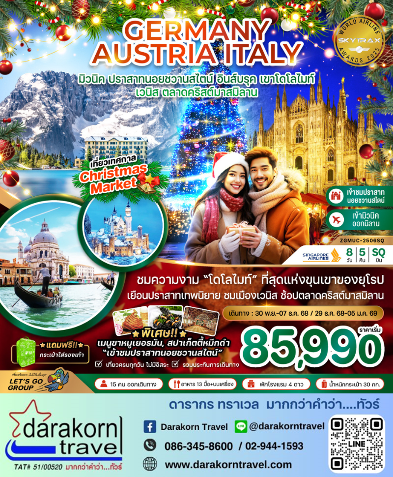 ทัวร์ยุโรป -โดโลไมท์ เวนิส ตลาดคริสมาสต์ (เยอรมัน ออสเตรีย อิตาลี) 8วัน5คืน(SQ)เดือนธันวาคม 2568