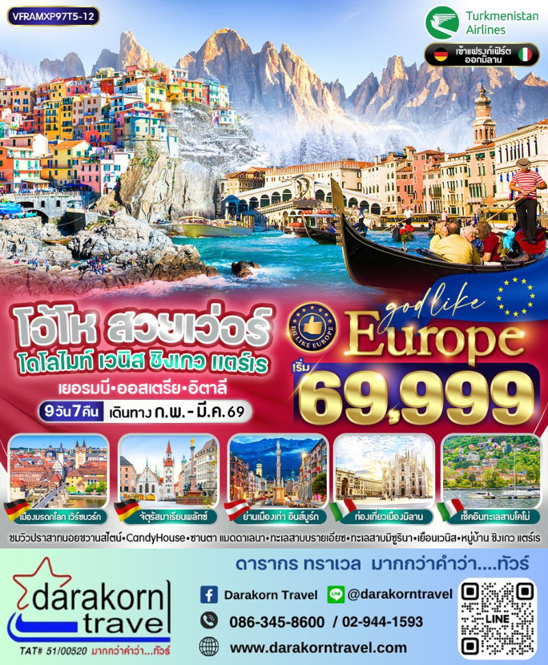 ทัวร์ยุโรป - โอ้โห สวยเว่อร์ โดโลไมท์ เวนิส ชิงเกวแตร์เร 9วัน7คืน(T5)เดือนกุมภาพันธ์ - มีนาคม 2569