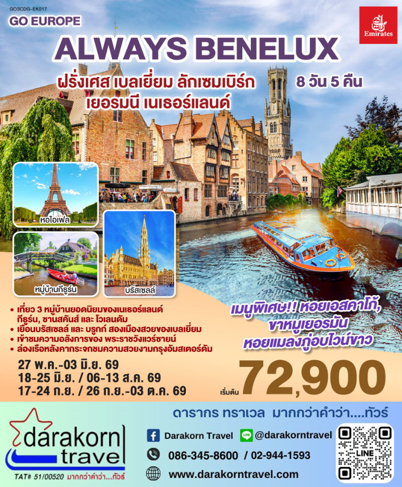 ทัวร์ยุโรป - ALWAYS BENELUX 8วัน5คืน(EK)เดือนพฤษภาคม - กันยายน 2569