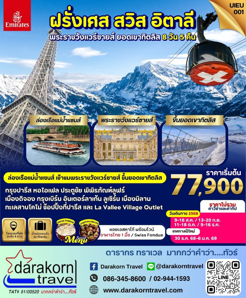 ทัวร์ยุโรป - France Swiss Italy 8วัน5คืน(EK)เดือนตุลาคม - ธันวาคม 2568