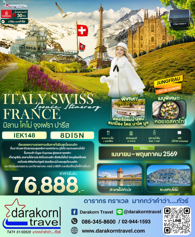 | DAY4 | เมืองลูเซิร์น – สถานีกรินเดลวัลด์ – ขึ้นกระเช้าไอเกอร์ เอ็กเพรส สู่ สถานีไอเกอร์เกลตเชอร์ – ต่อรถไฟ สู่ สถานีรถไฟจุงเฟรายอร์ค – ปราสาทน้ำแข็ง – อัลไพน์ เซนเซชัน – สฟิงซ์ฮอลล์ – รถไฟไต่เขาลงจากยอดเขาจุงเฟรา – ลงกระเช้าไอเกอร์ เอ็กเพรส สู่ สถานีกรินเดลวัลด์ – เมืองดิจอง |