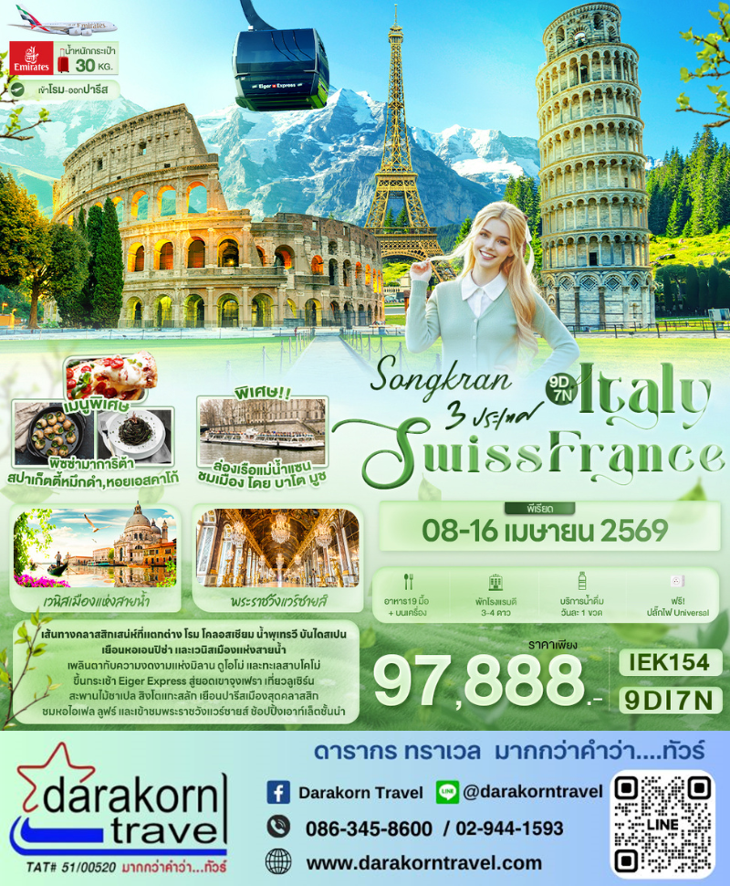 | DAY1 | ท่าอากาศยานนานาชาติสุวรรณภูมิ ประเทศไทย – ท่าอากาศยานนานาชาติดูไบ ประเทศสหรัฐอาหรับเอมิเรต แวะพักเปลี่ยนเครื่อง – ท่าอากาศยานนานาชาติเลโอนาร์โด ดา วินชี-ฟีอูมีชีโน ประเทศอิตาลี – กรุงโรม |
