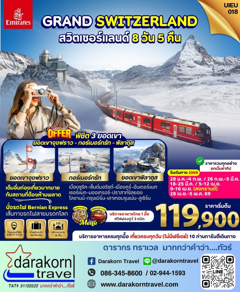 ทัวร์ยุโรป - Switzerland 3 Mountains 8วัน5คืน(EK)เดือนมกราคม - เมษายน 2569