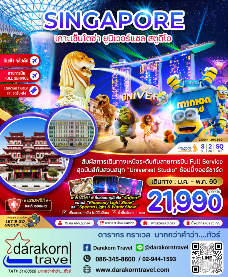 | DAY1 | สนามบินสุวรรณภูมิ – สนามบินชางงี – ประเทศสิงคโปร์ – น้ำพุแห่งความมั่งคั่ง – เมอร์ ไลออน พาร์ค – การ์เด้นส์ บาย เดอะ เบย์– RHAPSODY LIGHT SHOW – มารีน่า เบย์ แซนด์ส – โชว์น้ำพุ SPECTRA LIGHT & WATER SHOW |