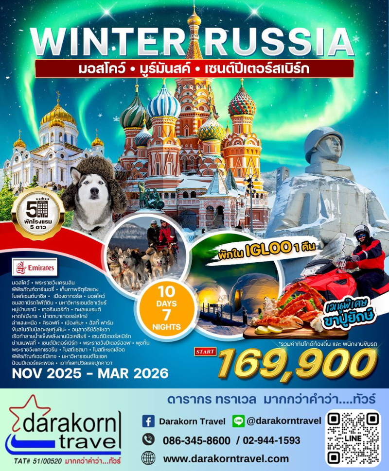 DAY4 | มอสโคว์ – มูร์มันสค์(เที่ยวบินภายในประเทศ) – หมู่บ้านซามิ*** พักห้องพักสไตล์ IGLOO *** |