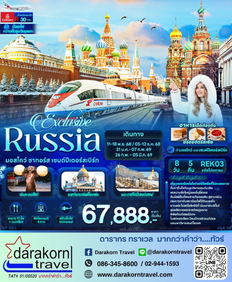 ทัวร์รัสเซีย - Exclusive Russia มอสโคว์ ซากอร์ส เซนต์ปีเตอร์สเบิร์ก 8วัน5คืน(EK)เดือนพฤศจิกายน 2568 - กุมภาพันธ์ 2569