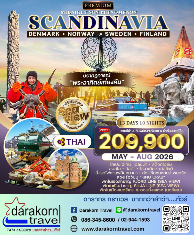 | ทัวร์สแกนดิเนเวีย – ชมพระอาทิตย์เที่ยงคืน พักเรือสำราญ 2 ลำ SEAVIEW 13วัน10คืน(TG)เดือนพฤษภาคม – สิงหาคม 2569 |