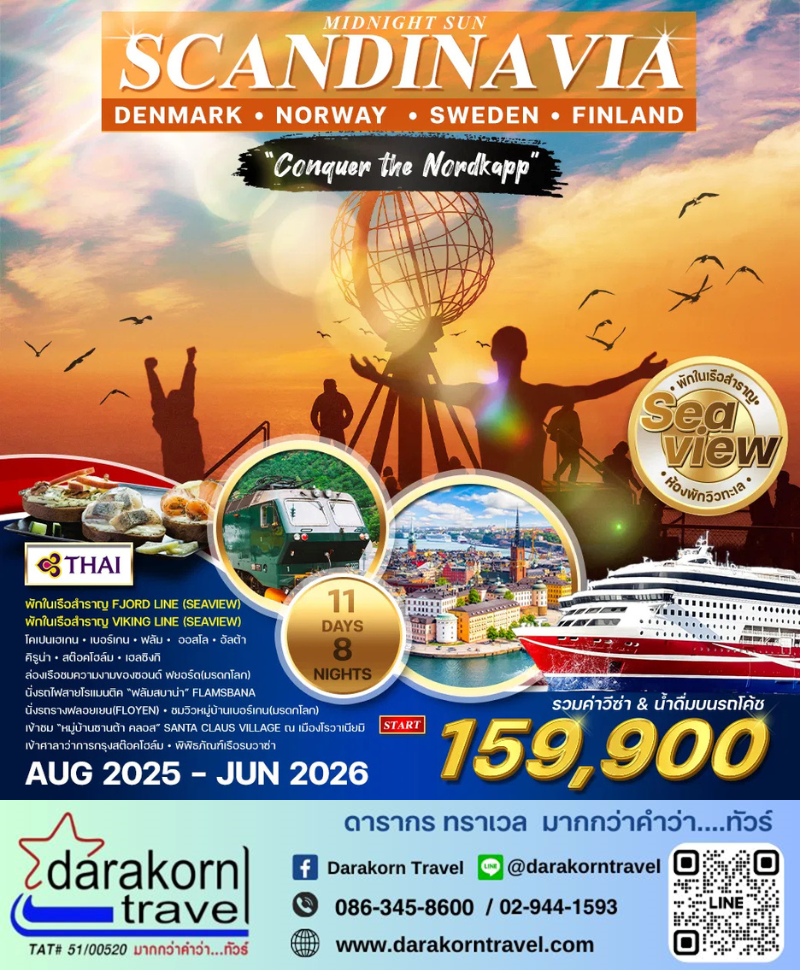 | ทัวร์สแกนดิเนเวีย – พิชิตแหลมเหนือ “นอร์ดเคป” พักบนเรือสำราญ 2 ลำ 11วัน8คืน(TG)เดือนตุลาคม 2568 – มิถุนายน 2569 |