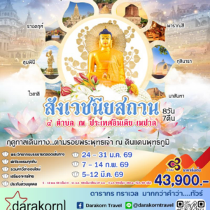| DAY5 | ฟรี รับชุดบูชา องค์ดั้คชูเศรษฐ์องค์ดั๊กดูเศรษฐ์ ฮาลไว คณาปิติคเณศวรปางมหาเศรษฐี – เทวสถานศรีวรทาวินายัก – องค์คเณศวรศรีบัลลาเลศวร – มุมไบ สนามบินมุมไบ TG318 23.35 |