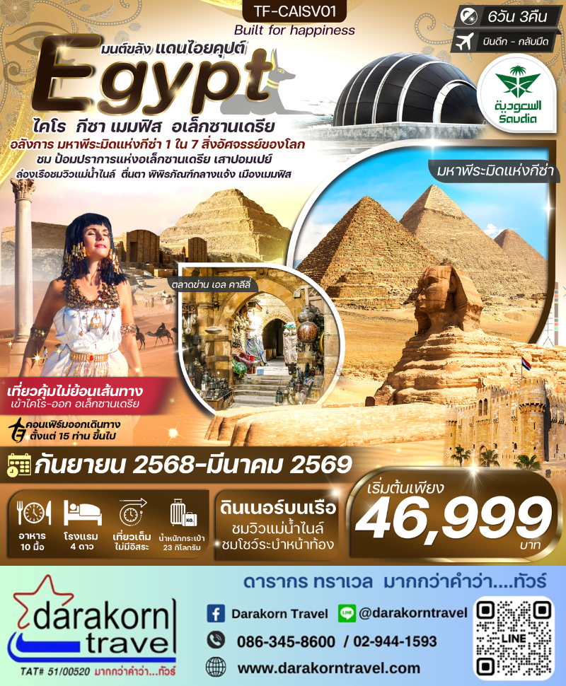 | DAY5 | ไคโร-อเล็กซานเดรีย-ป้อมปราการแห่งอเล็กซานเดรียหอสมุดแห่งอเล็กซานเดรีย-สุสานใต้ดิน-เสาปอมเปย์- สนามบินอเล็กซานเดรีย-สนามบินเจดดาห |