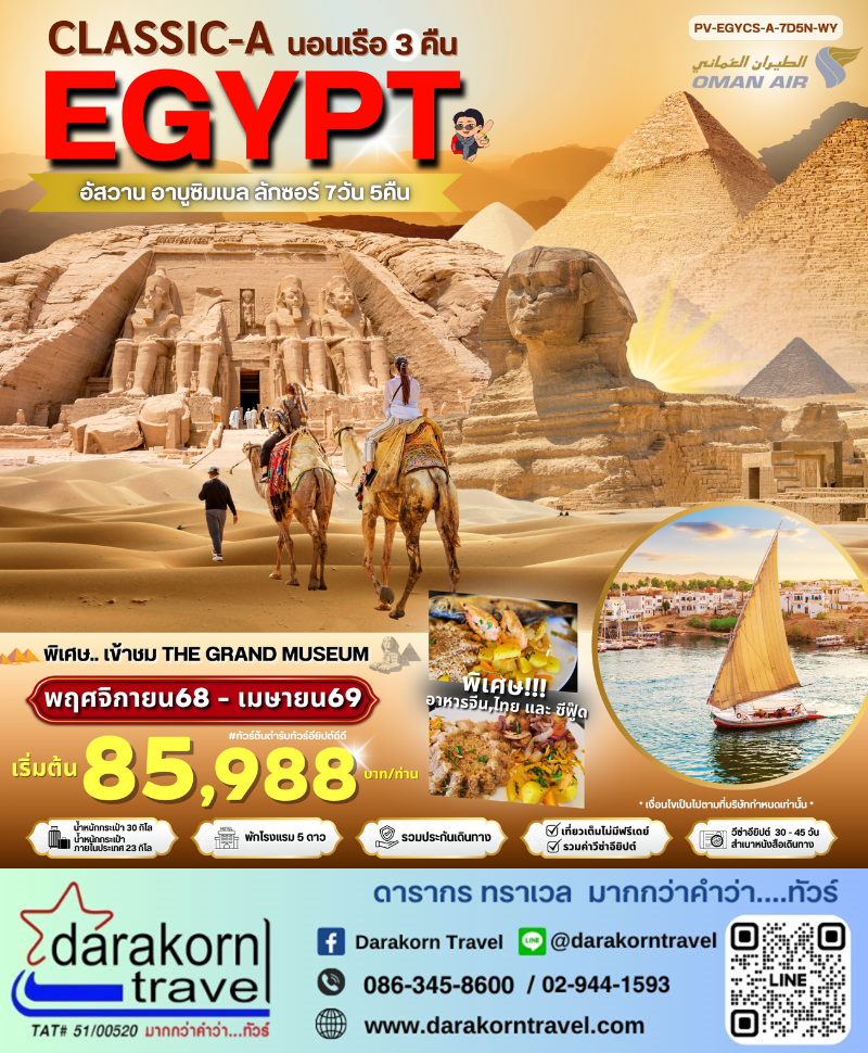ทัวร์อียิปต์ - CLASSIC-A-EGYPT สัมผัสมนต์เสน่ห์แห่งลุ่มแม่น้ำไนล์ 7วัน5คืน(WY)เดือนพฤศจิกายน 2568 - เมษายน 2569