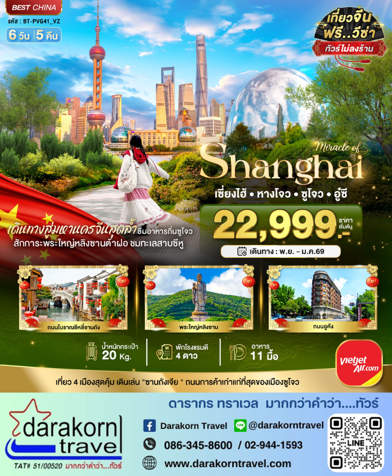 ทัวร์จีน - มหัศจรรย์...เซี่ยงไฮ้ หางโจว อู๋ซี ซูโจว เมืองโบราณจูเจียเจียว 6วัน5คืน(VZ)เดือนพฤศจิกายน 2568 - มกราคม 2569