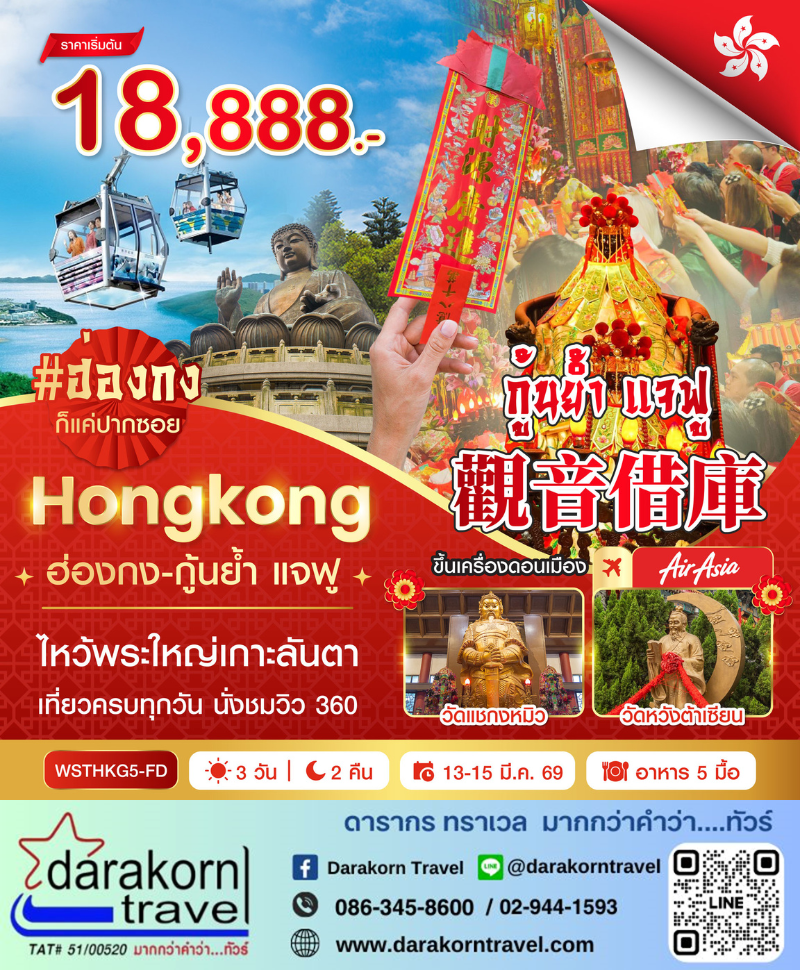 | DAY1 | กรุงเทพฯ-สนามบินดอนเมือง-ฮ่องกง-จุดชมวิววิตอเรีย-เจ้าแม่กวนอิมรีพลัสเบย์-วัดเจ้าแม่กวนอิมฮองฮำ ***1 ปีมีครั้งเดียว พิธียืมเงินเจ้าแม่กวนอิมฮองฮำ*** |