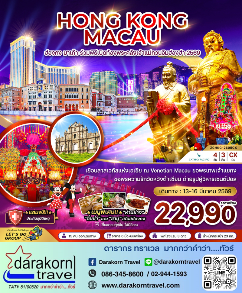 | DAY3 | ฮ่องกง – มาเก๊า – วัดอาม่า – วิหารเซนต์ปอล – เซนาโด้สแควร์ – ร้านขนมพื้นเมือง – เดอะ ลอนดอนเนอร์ –เดอะ ปารีเซียน – เวเนเชี่ยน – ฮ่องกง |