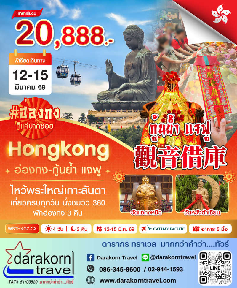 | DAY2 | จุดชมวิววิคตอเรีย-เจ้าแม่กวนอิมรีพลัสเบย์-วันหลินฟ้า-นั่งกระเช้านองปิง 360-วัดโป่หลินไหว้พระใหญ่เกาะลันเตา-ช้อปปิ้งที่ซิตี้เกทเอาท์เล็ท-วัดเจ้าแม่กวนอิมฮองฮำ ***1 ปีมีครั้งเดียว พิธียืมเงินเจ้าแม่กวนอิมฮองฮำ*** |