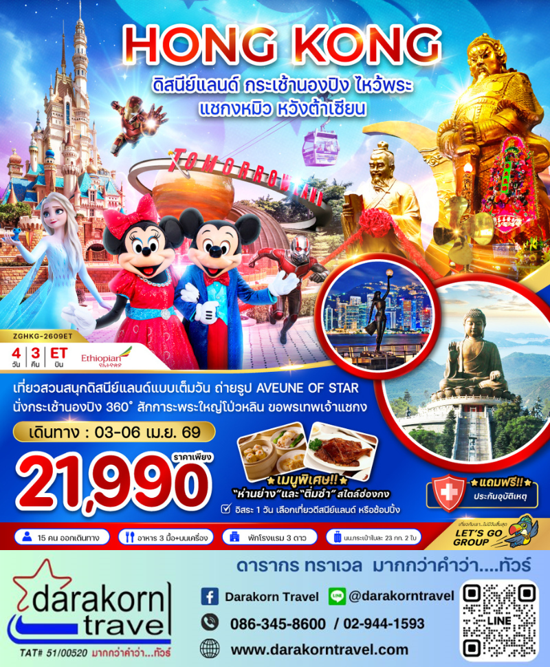 | DAY2 | ฮ่องกงดิสนีย์แลนด์เต็มวัน ชมการแสดงดอกไม้ไฟ(บริการรถรับ – ส่ง) |