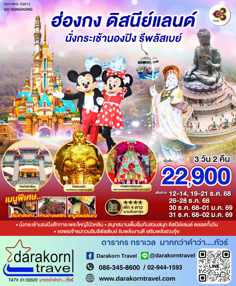 ทัวร์ฮ่องกง - ดิสนีย์แลนด์ นั่งกระเช้านองปิง รีพลัสเบย์ 3วัน2คืน(TG)เดือนธันวาคม 2568