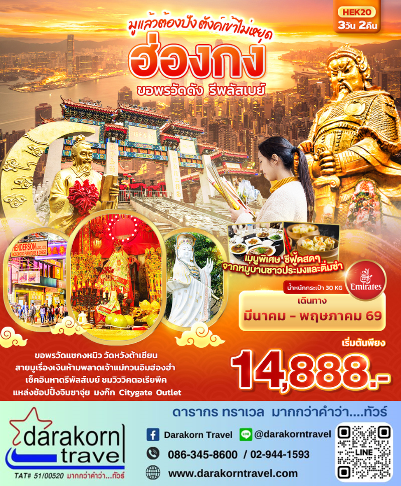 | DAY3 | อ่าวรีพัลสเบย์+วัดเจ้าแม่กวนอิมทินหัว – วิคตอเรียพีค – Citygate Outlet – ท่าอากาศยานนานาชาติฮ่องกง – ท่าอากาศยานนานาชาติสุวรรณภูมิ |