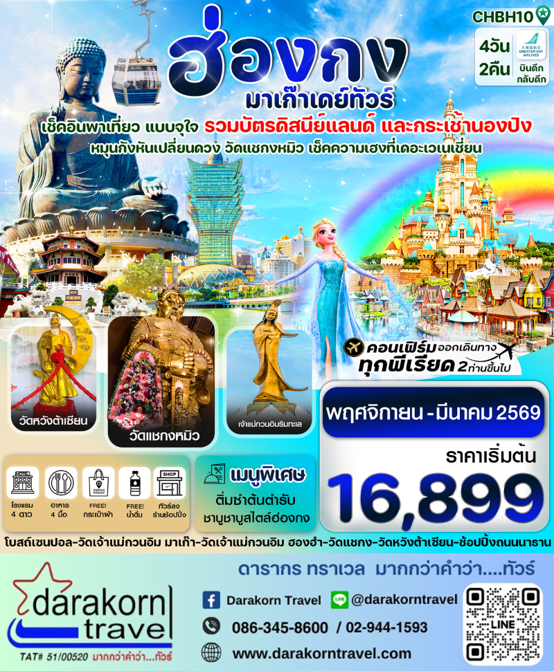 ทัวร์ฮ่องกง - ฮ่องกง มาเก๊าเดย์ทัวร์ เที่ยวจุใจ 4วัน2คืน(HB)เดือนมกราคม - มีนาคม 2569