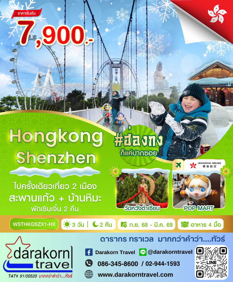 | DAY2 | กรุงเทพฯ-ฮ่องกง-เซินเจิ้น-ตงก่วน-สะพานแก้ว-บ้านหิมะ-ช้อปปิ้งหลอหวู่-เซินเจิ้น |