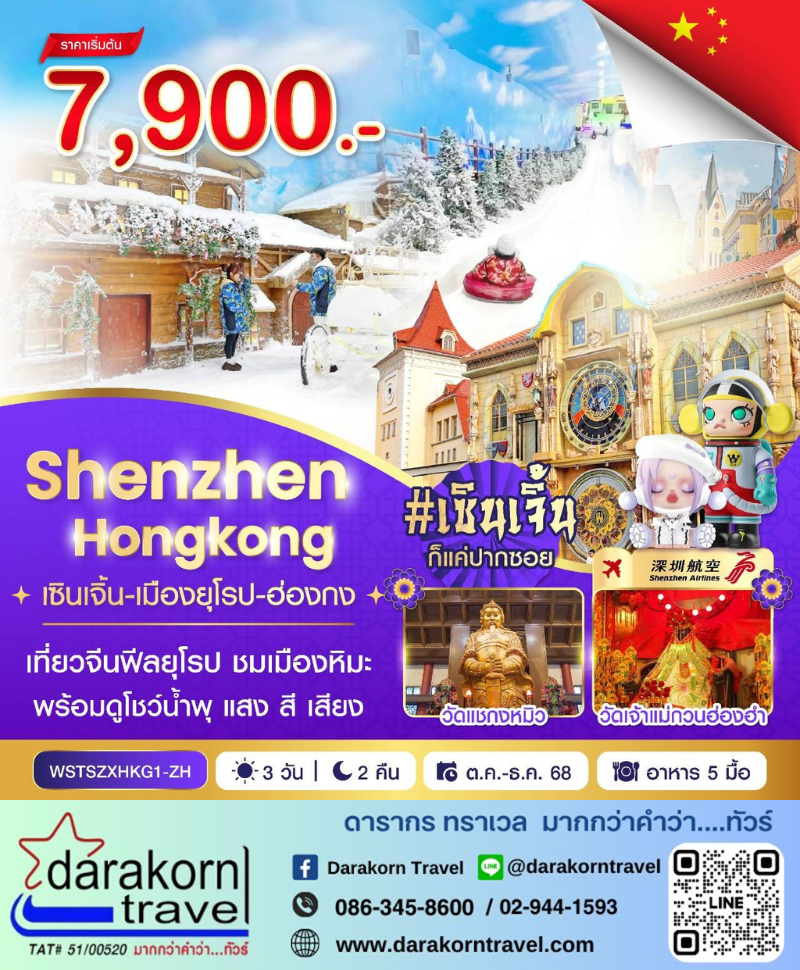 DAY1 | กรุงเทพฯ-เซินเจิ้น-BKK-SZX ZH306 0315-0715-วัดกวนอู-เมืองยุโรปมาเลเนีย-เมืองหิมะ (Snow Town)-ถนนคนเดินตงเหมิน-Oh Bay-โชว์น้ำพุดนตรี |