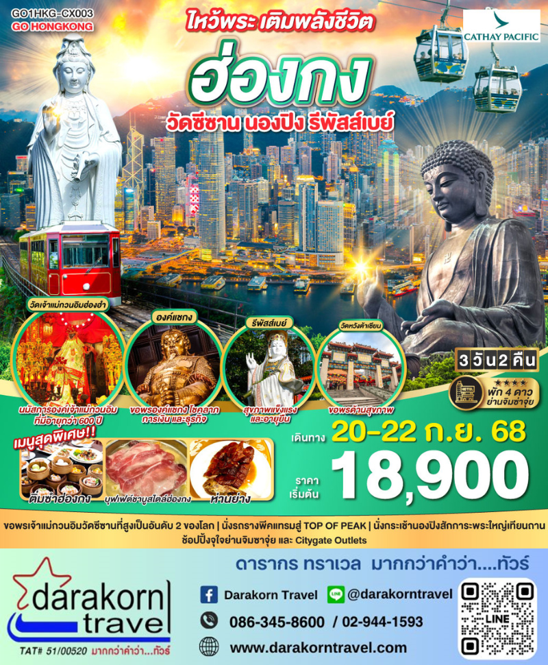 ทัวร์ฮ่องกง - ไหว้พระ เติมพลังชีวิต ฮ่องกง วัดซีซาน นองปิง รีพัสส์เบย์ 3วัน2คืน(CX)เดือนกันยายน 2568