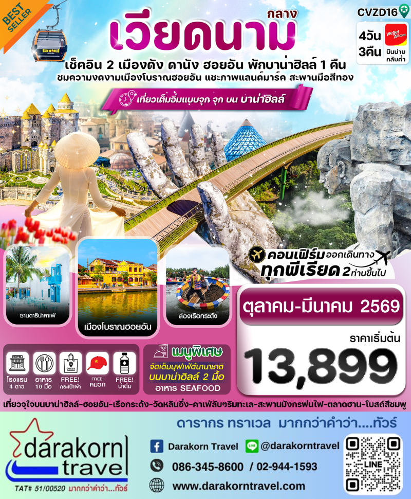 | DAY4 | บาน่าฮิลล์ – ดานัง – โบสถ์สีชมพู – ตลาดฮาน –สนามบินดานัง – สุวรรณภูมิ |