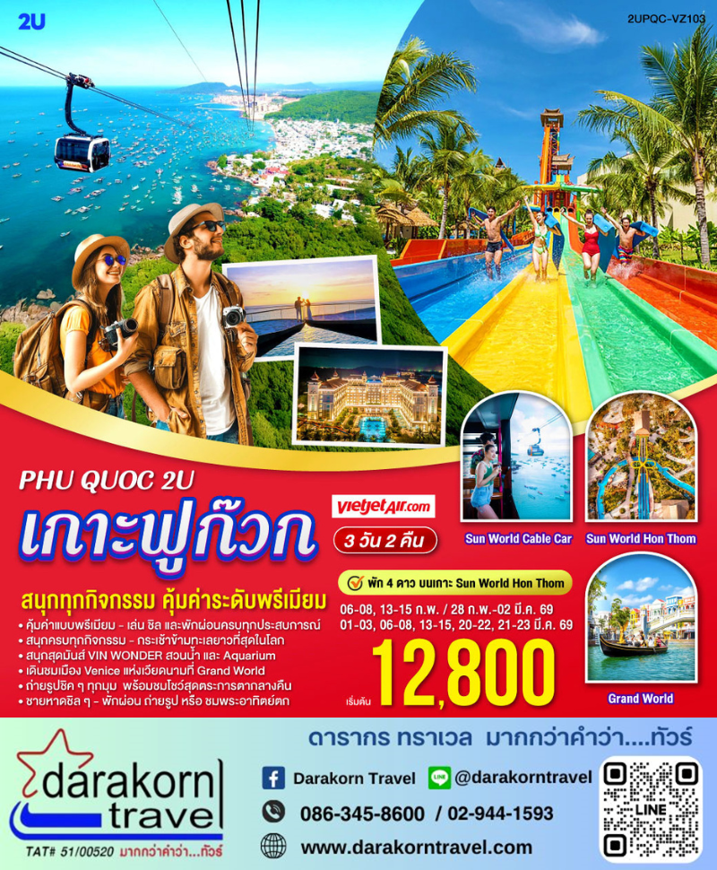 | DAY3 | อาหารเช้า ณ โรงแรม (มื้อที่ 4) • ถ่ายภาพเช็กอินที่ สะพานจูบ (Kiss Bridge) • นั่งกระเช้าทะเลข้ามเกาะ Hon Thom • ถ่ายรูปชมบรรยากาศโซน Sunset Town • อิสระอาหารกลางวัน • เดินทางสู่สนามบิน แจกขนมปังเวียดนาม (Banh Mi) ท่านละ 1 ชิ้น • เดินทางกลับ (เช็คอินสัมภาระ 1 ชิ้น ≤ 20 กก./ท่าน , ขึ้นเครื่อง 1 ชิ้น ≤ 7 กก./ท่าน) Vietjet Air (VZ983 | PQC-BKK | 16.45-18.05 • (เวลา:18.02 น.) ถึงกรุงเทพฯ (ท่าอากาศยานสุวรรณภูมิ) โดยสวัสดิภาพ จบทริปพร้อมความประทับใจ |