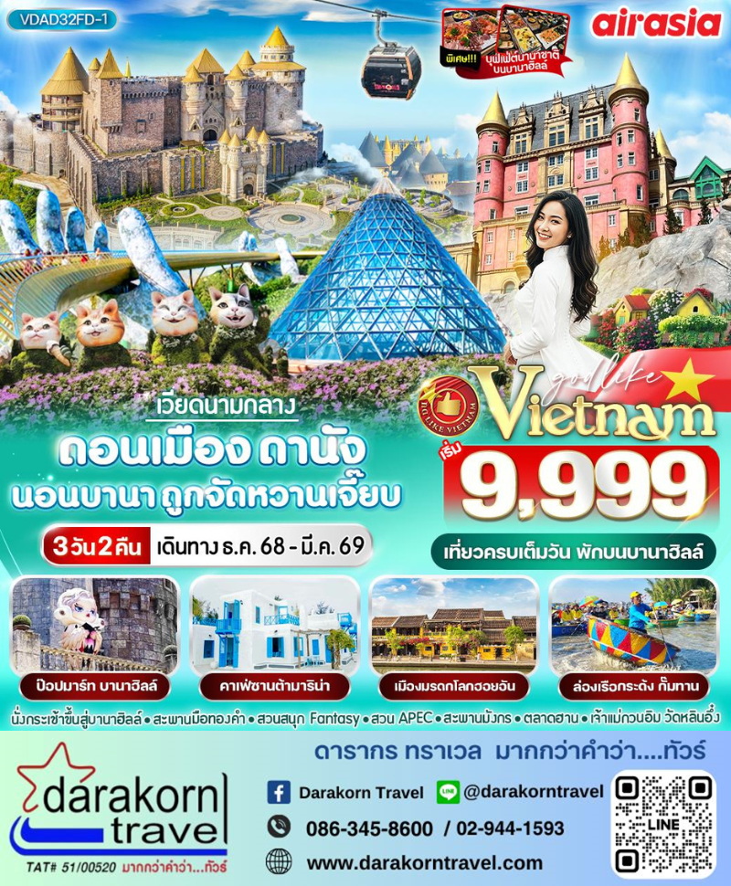 | DAY1 | สนามบินดอนเมือง – สนามบินดานัง – สวนApec Park – ร้านหยกและอัญมณี – นั่งกระเช้าไฟฟ้าขึ้นสู่บานาฮิลล์ (หมู่บ้านฝรั่งเศส – สะพานมือทองคำ – สวนดอกไม้ – สวนสนุกFantasy Park) |