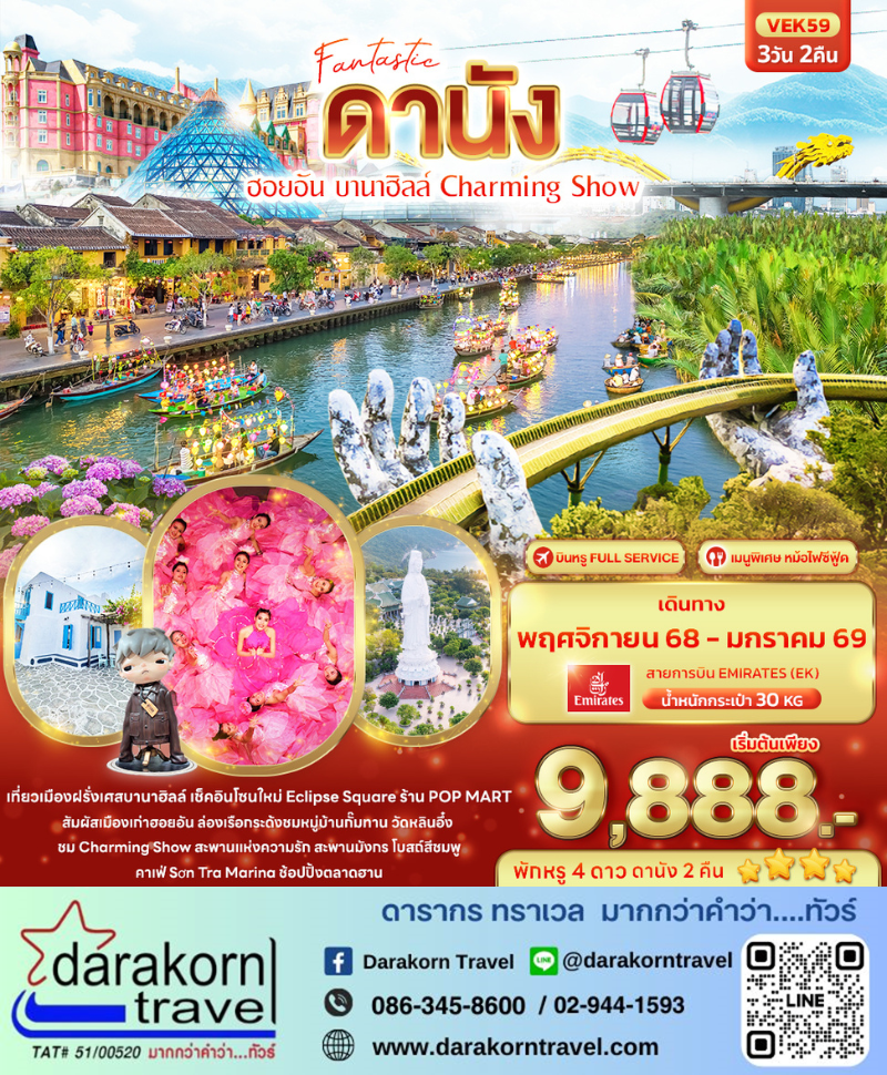DAY3 | เมืองดานัง – เมืองฮอยอัน – หมู่บ้านแกะสลักหินอ่อน – หมู่บ้านกั๊มทาน – นั่งเรือกระด้ง – เมืองมรดกโลกฮอยอัน – ดานัง – ร้านผ้าไหม – โบสถ์สีชมพู – ช้อปปิ้งตลาดฮาน – ร้านเยื่อไผ่ – วัดหลินอึ๋ง – คาเฟ่ Sơn Trà Marina (ไม่รวมค่าอาหารและเครื่องดื่ม) – ท่าอากาศยานนานาชาติดานัง – ท่าอากาศยานนานาชาติสุวรรณภูมิ |