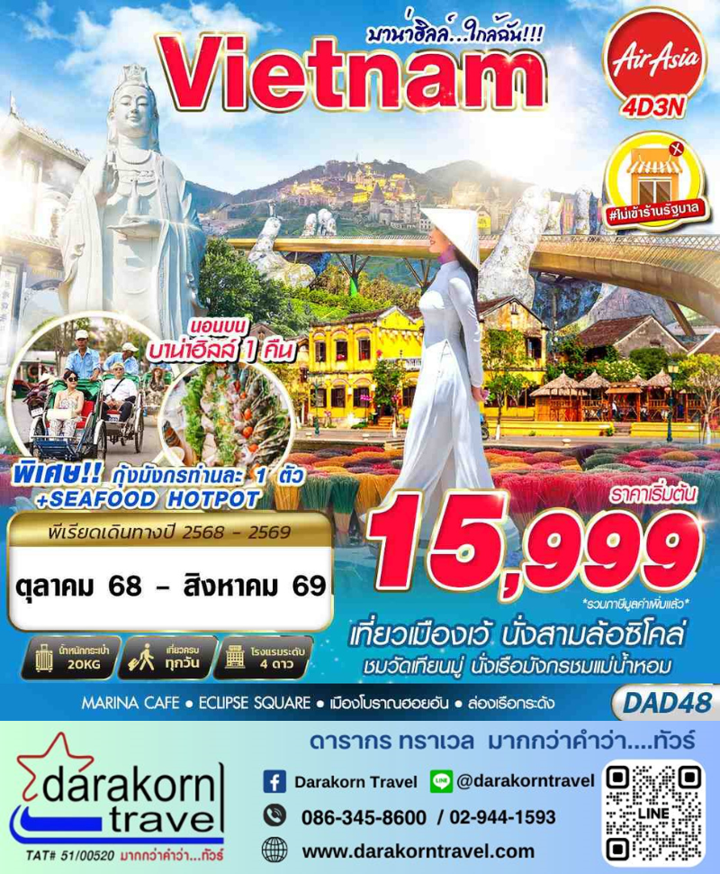 | DAY1 | กรุงเทพฯ(ท่าอากาศยานดอนเมือง) – ท่าอากาศยานนานาชาติดานัง – วัดหลินอึ๋ง – นั่งสามล้อชมพระราชวัง(ด้านนอก) – วัดเทียนมู่ – ล่องเรือมังกร |