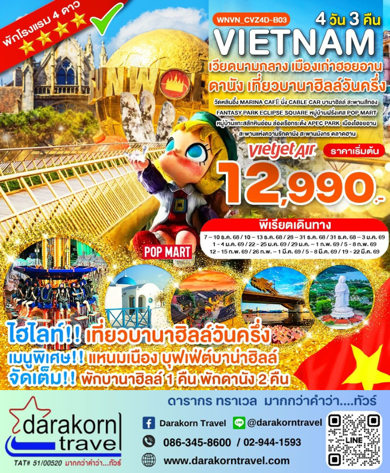 DAY1 | ท่าอากาศยานสุวรรณภูมิ – สนามบินดานัง – บาน่าฮิลล์ – สะพานสีทอง Fantasy Park – หมู่บ้านฝรั่งเศส – Eclipse Square – Pop Mart – พักบานาฮิลล์ |