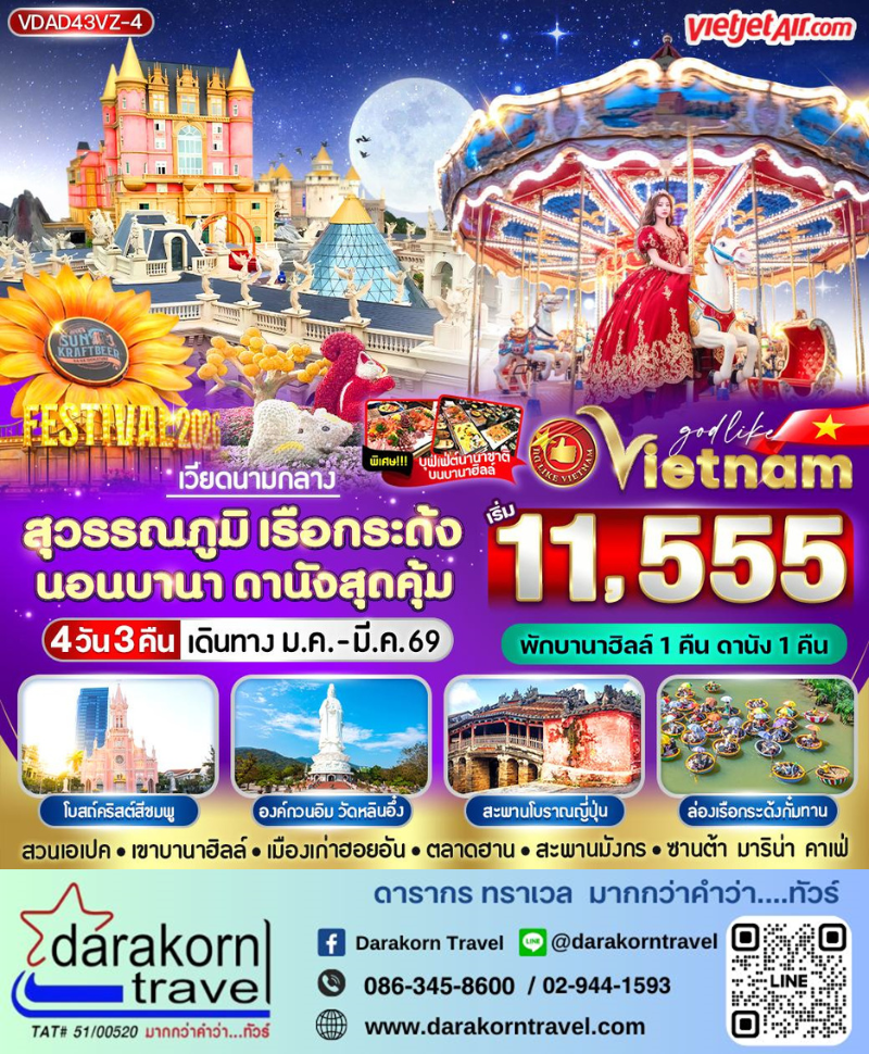 | DAY1 | ท่าอากาศยานสุวรรณภูมิ– ท่าอากาศยานเมืองดานัง (ประเทศเวียดนาม) – เมืองดานัง – วัดนามเซิน (Nam Son Pagoda) – นั่งกระเช้าไฟฟ้าขึ้นสู่บานาฮิลล์ (หมู่บ้านฝรั่งเศส-สะพานมือทองคำ–สวนดอกไม้) |