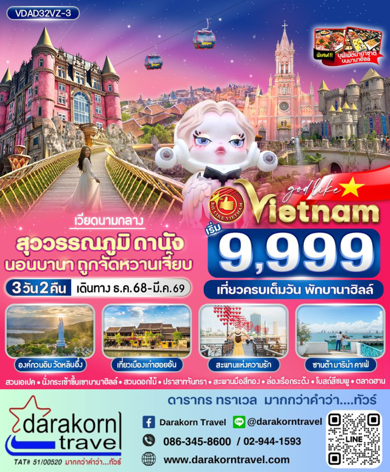 | DAY1 | สนามบินสุวรรณภูมิ – สนามบินดานัง – สวนApec Park – ร้านหยกและอัญมณี – นั่งกระเช้าไฟฟ้าขึ้นสู่บานาฮิลล์ (หมู่บ้านฝรั่งเศส – สะพานมือทองคำ – สวนดอกไม้ – สวนสนุกFantasyPark) |