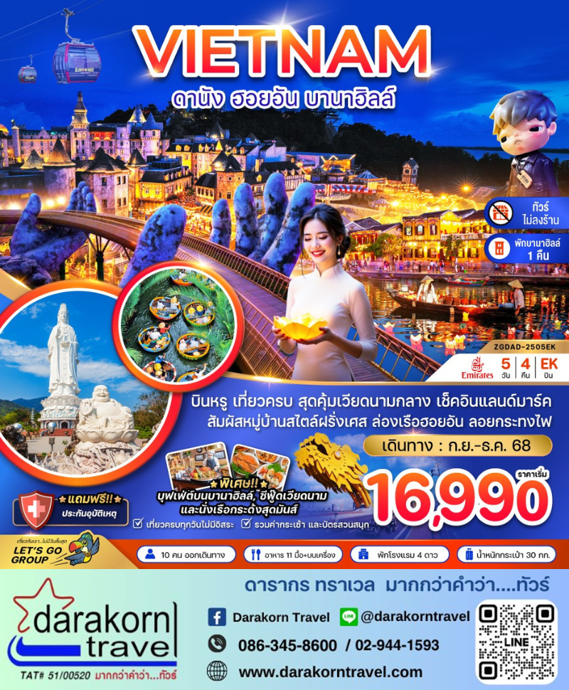 | DAY1 | สนามบินสุวรรณภูมิ – สนามบินดานัง – เมืองดานัง |