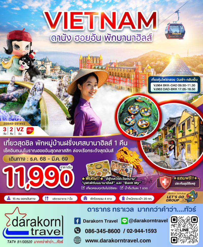 | DAY1 | สนามบินสุวรรณภูมิ – สนามบินดานัง – สะพานมังกรดานัง –สะพานแห่งความรักดานัง – บานาฮิลล์ – นั่งกระเช้าซัน เวิลด์บานา ฮิลล์ – สะพานมือยักษ์ –สวนดอกไม้แห่งความรัก – พระพุทธรูปหลินอึ๋ง – ป๊อปมาร์ท |
