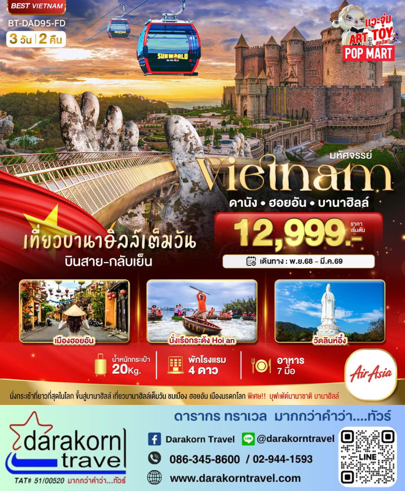 | DAY1 | ดอนเมือง กรุงเทพฯ •ดานัง เวียดนาม•หมู่บ้านกั๊มทาน•นั่งเรือกระด้งเมืองโบราณฮอยอัน |