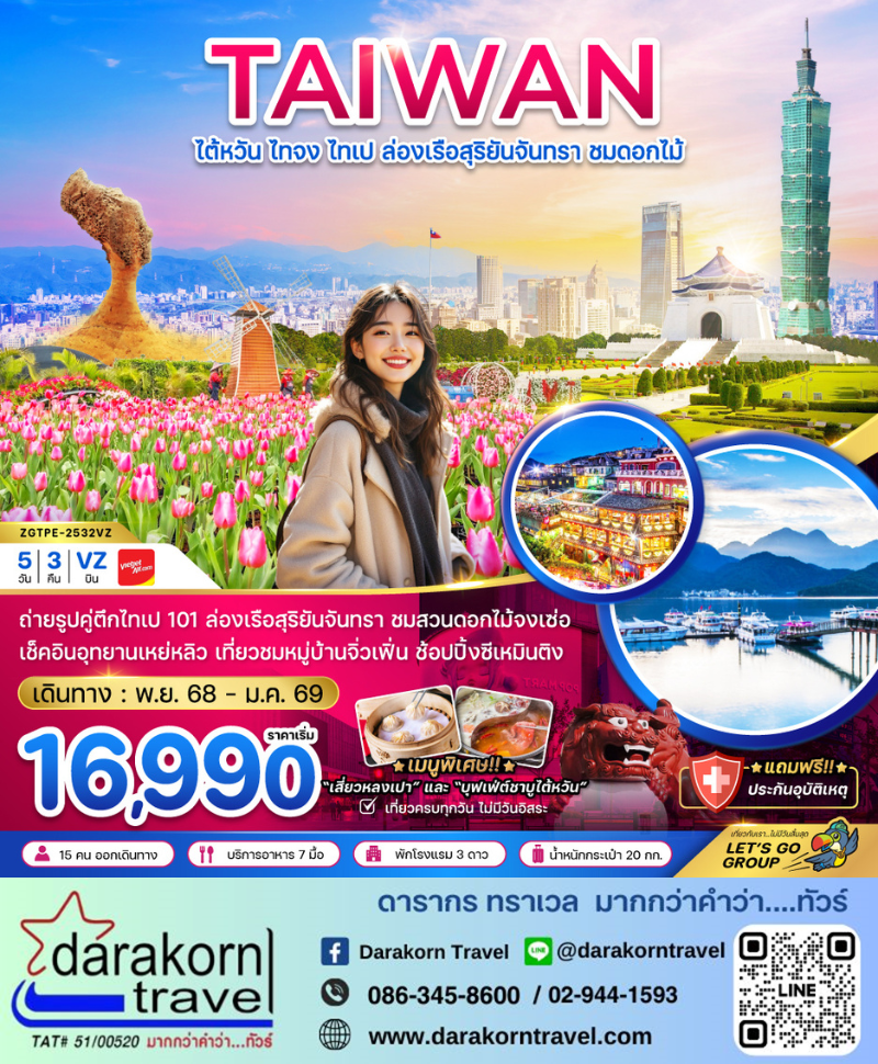 | ทัวร์ไต้หวัน – ไต้หวัน ไทจง ไทเป ล่องเรือสุริยันจันทรา บูราโน่แห่งไต้หวัน ชมดอกไม้ 5วัน3คืน(VZ)เดือนพฤศจิกายน 2568 – มกราคม 2569 |