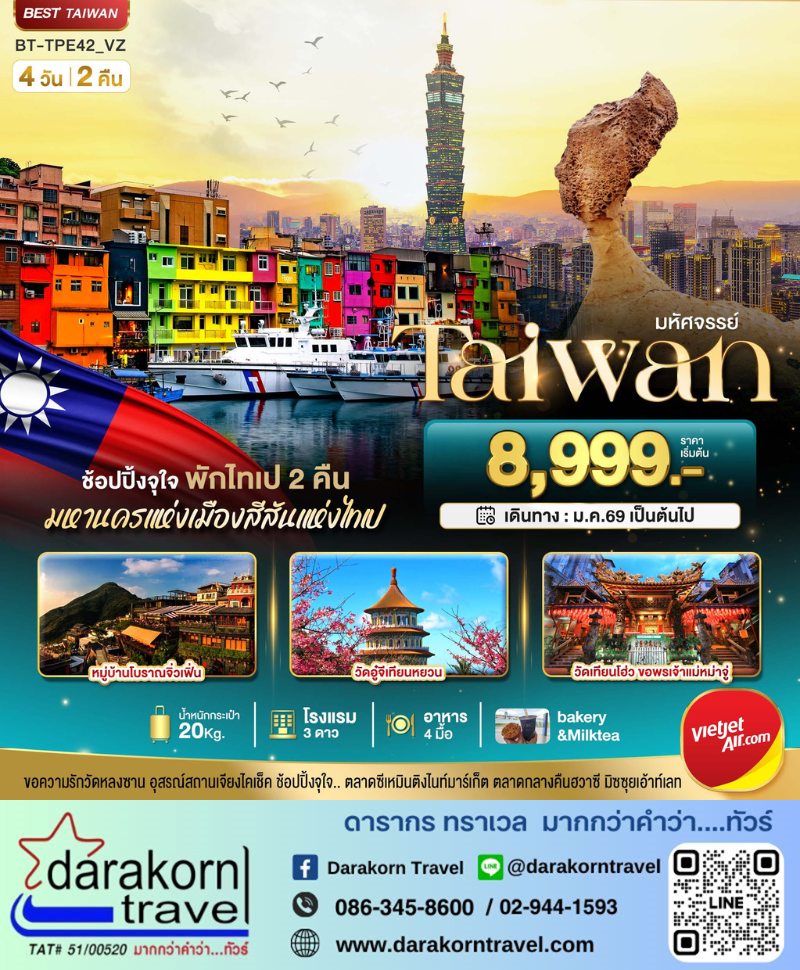 ทัวร์ไต้หวัน - มหัศจรรย์..TAIWAN ช้อปปิ้งจุใจ พักไทเป 2 คืน 4วัน2คืน(VZ)เดือนมกราคม - มีนาคม 2569