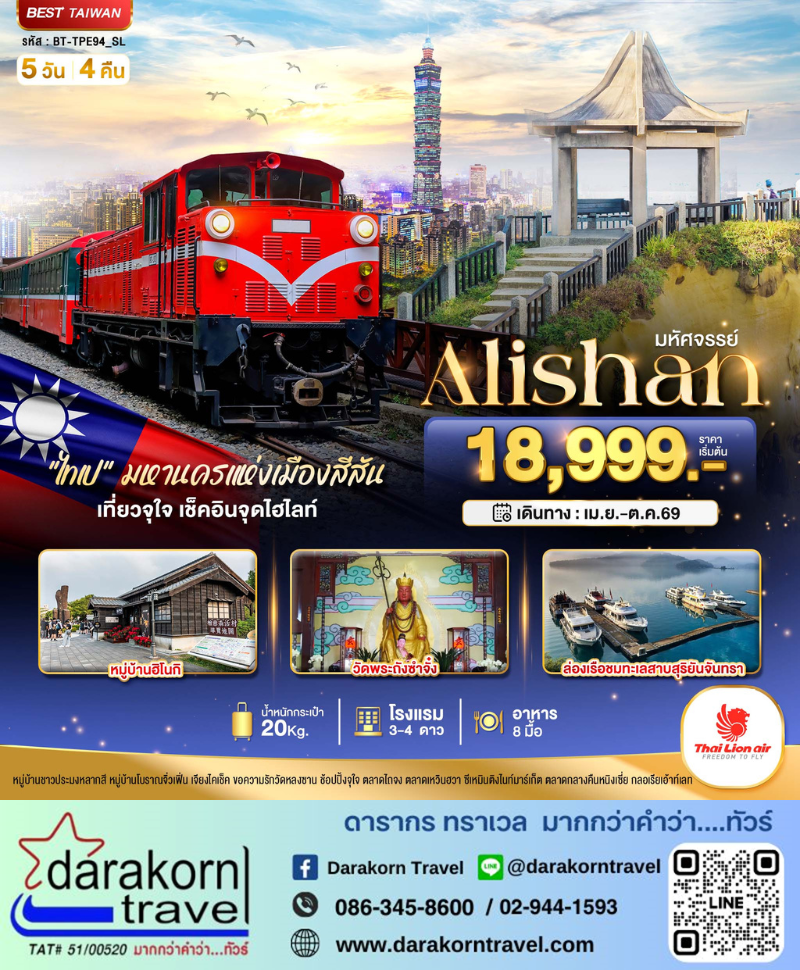 | DAY5 | ศูนย์เครื่องสำอาง •วัดหลงซาน •อนุสรณ์สถานเจียงไคเช็ค •ตึกไทเป101(ไม่รวมค่าขึ้นตึก)•เมืองเถาหยวน •กลอเรียเอ้าท์เลท•สนามบินเถาหยวน •สนามบินดอนเมือง กรุงเทพฯ |