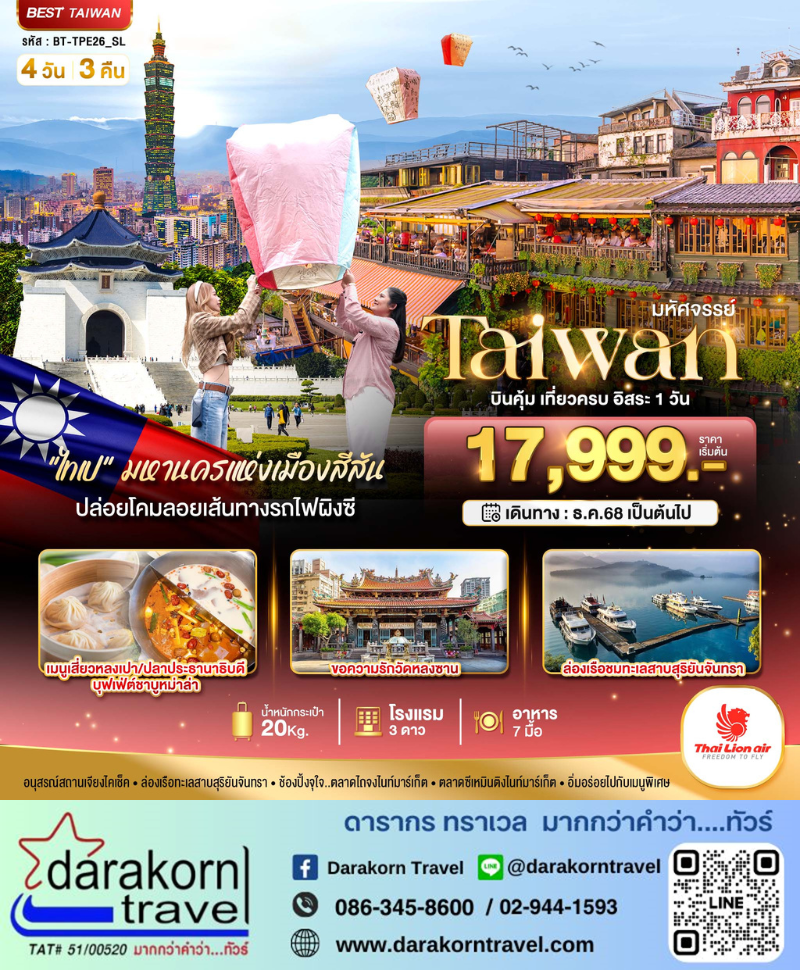 ทัวร์ไต้หวัน - มหัศจรรย์..TAIWAN มหานครแห่งเมืองสีสัน 4วัน3คืน(SL)เดือนธันวาคม 2568 - มกราคม 2569