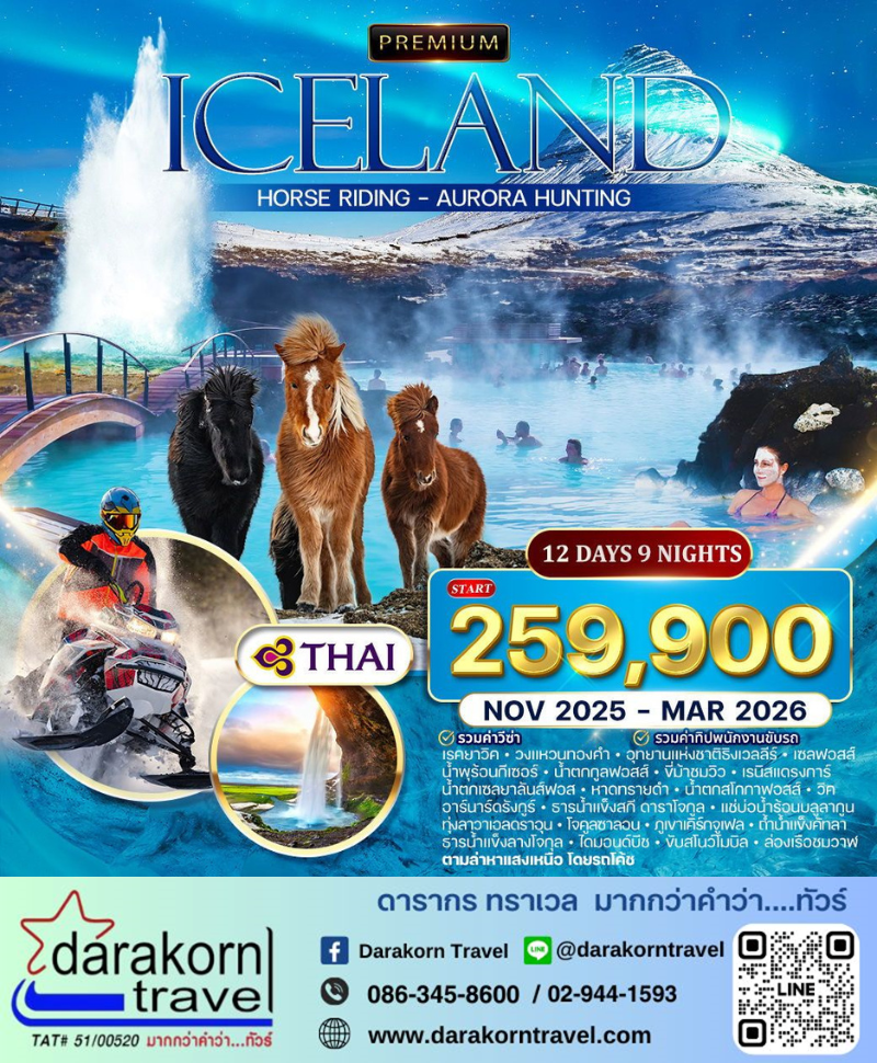 ทัวร์ไอซ์แลนด์ - พรีเมี่ยมไอซ์แลนด์ ตามล่าแสงเหนือ 12วัน9คืน(TG)เดือนพฤศจิกายน 2568 - มีนาคม 2569