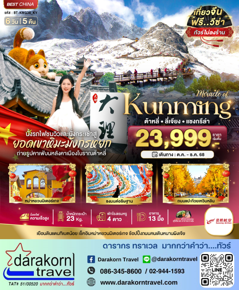 DAY5 | อุทยานมังกรหยก•นั่งกระเช้าขึ้นภูเขาหิมะมังกรหยก•โชว์ความประทับใจลี่เจี่ยง (โชว์จางอี้โหม่ว)•อุทยานน้าหยก•ทะลสาบไป๋สุยเหอ•สถานีรถไฟความเร็วสูง•เมืองคุนหมิง |