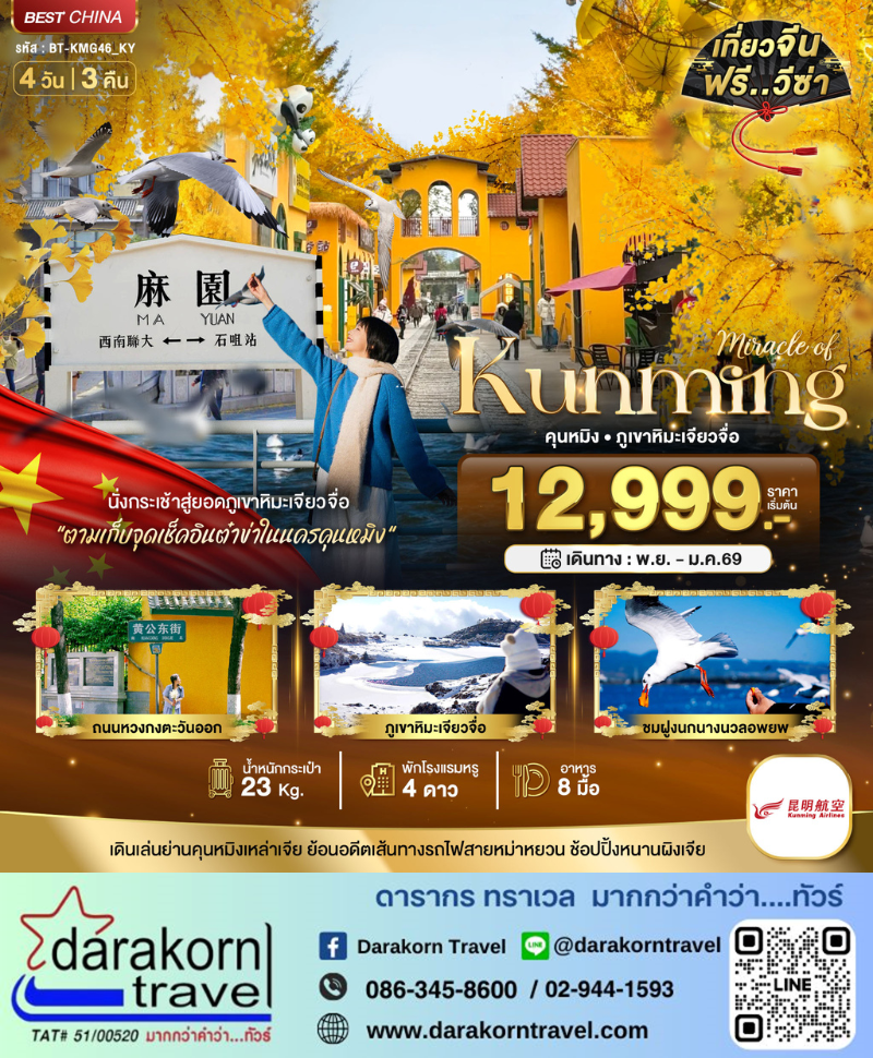 ทัวร์จีน - มหัศจรรย์...คุนหมิง ภูเขาหิมะเจียวจื่อ 4วัน3คืน(KY)เดือนพฤศจิกายน 2568 - มกราคม 2569